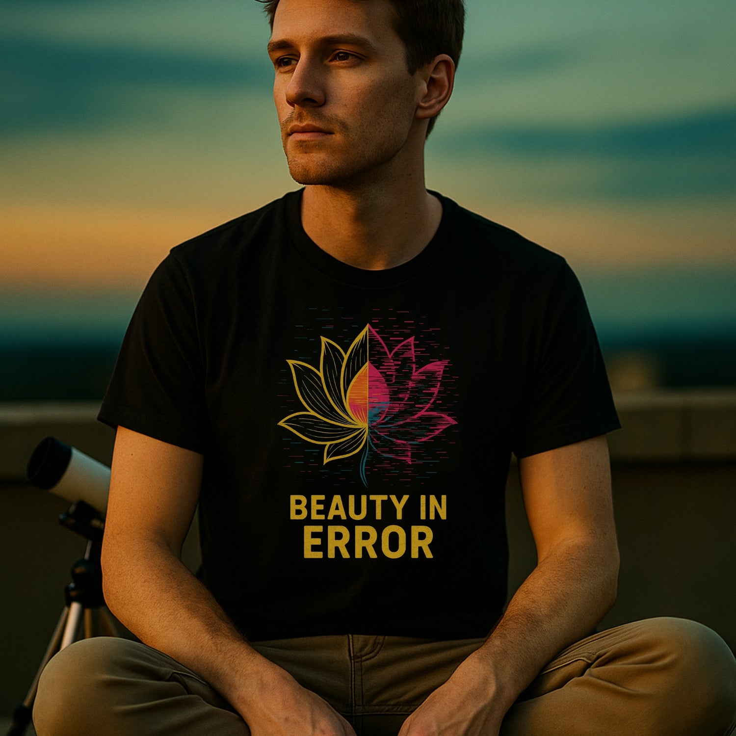 Mantras whispered through broken pixels. Glitched forests. Static sunsets. Peace collides with distortion in every thread. Tees for souls balancing calm and chaos — with a neon edge.