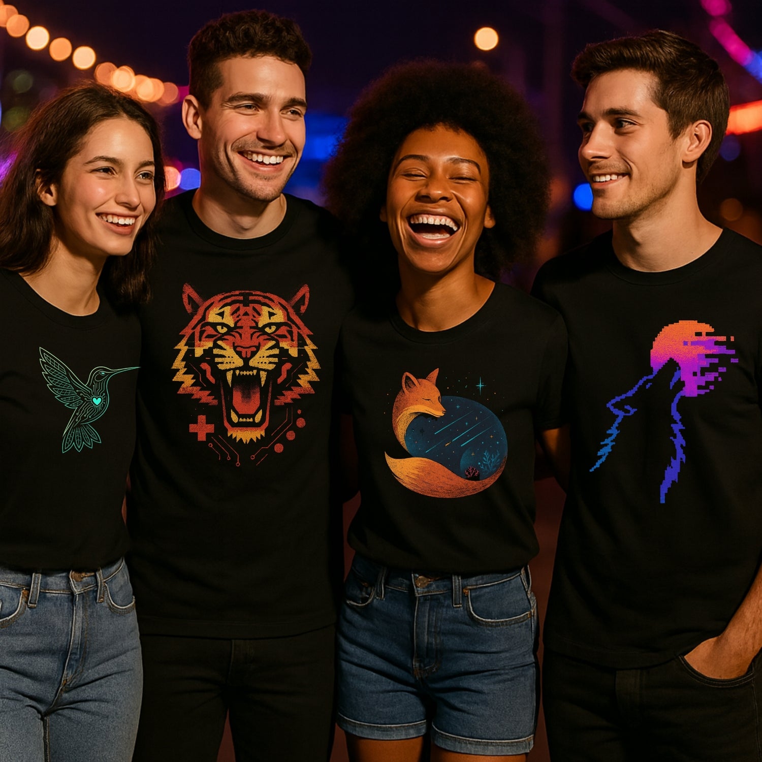 Analog hearts, digital sparks. We twist nature, retro tech, and surreal art into tees that feel like a second skin