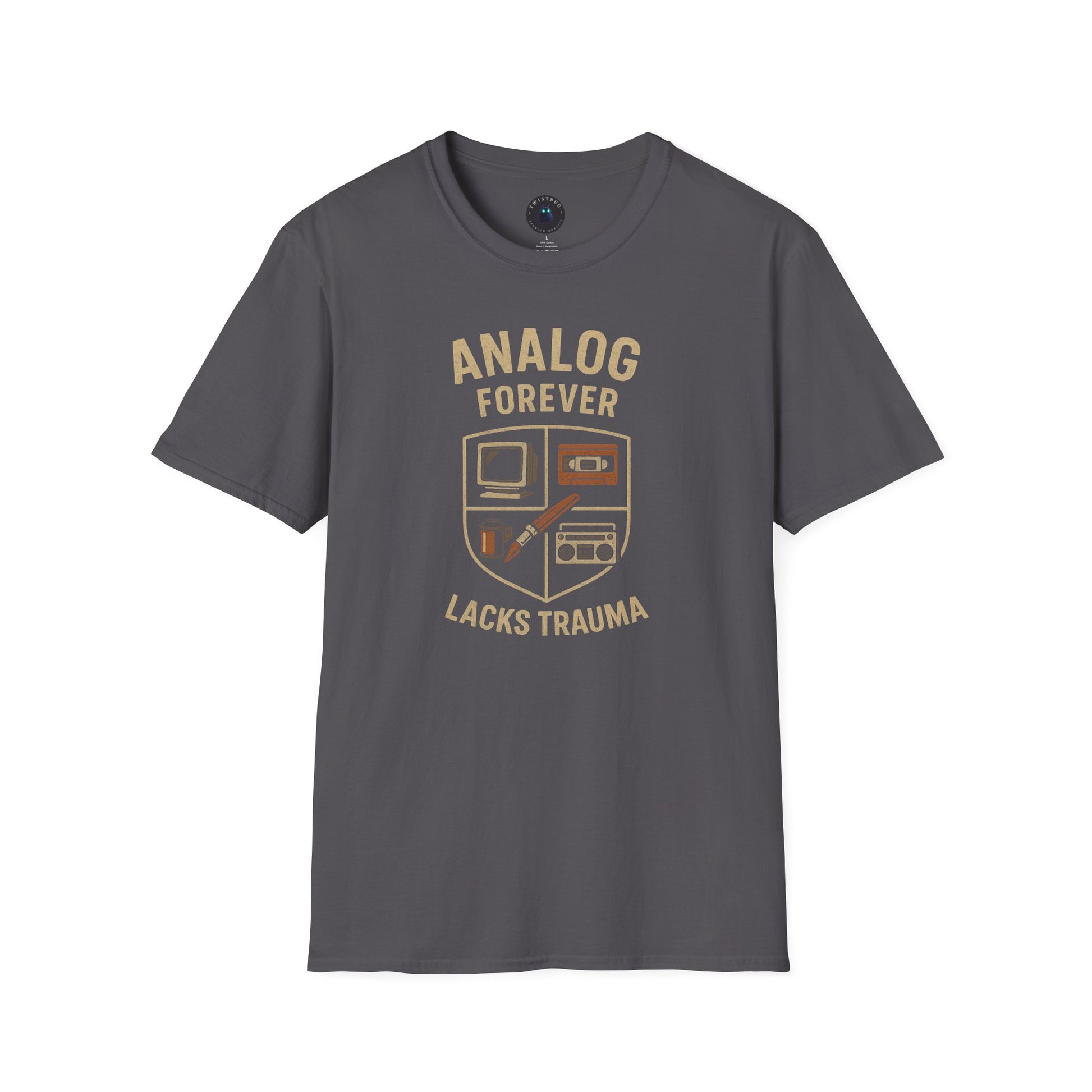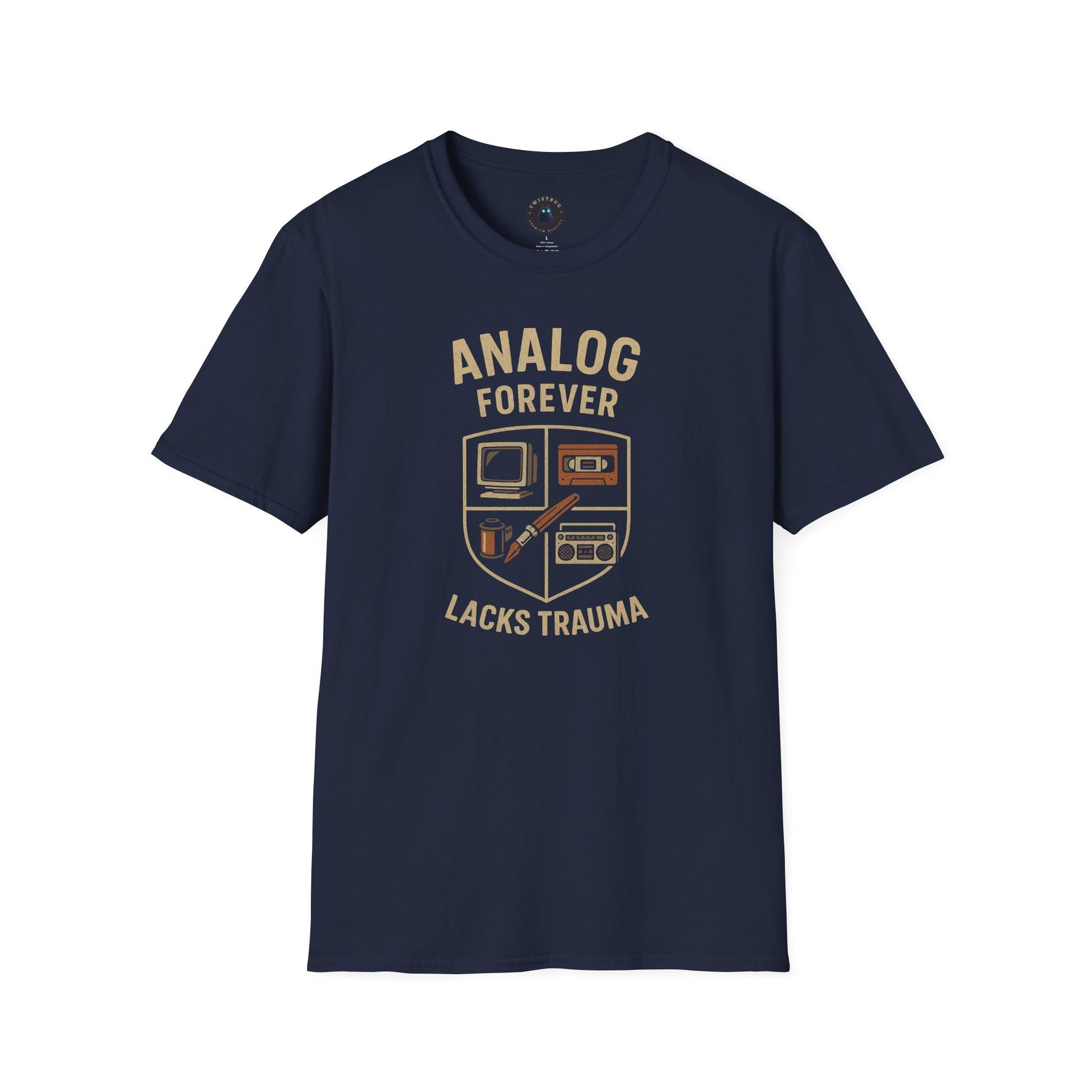 The “Analog Forever Lacks Trauma” T-shirt celebrates the golden age of creativity — when screens glowed softly, cassette tapes clicked, and art was made by hand. Featuring a retro crest of classic analog icons (CRT monitor, cassette tape, paintbrush, and boombox), it’s designed for artists, musicians, and nostalgic dreamers who still believe in the warmth of imperfection.