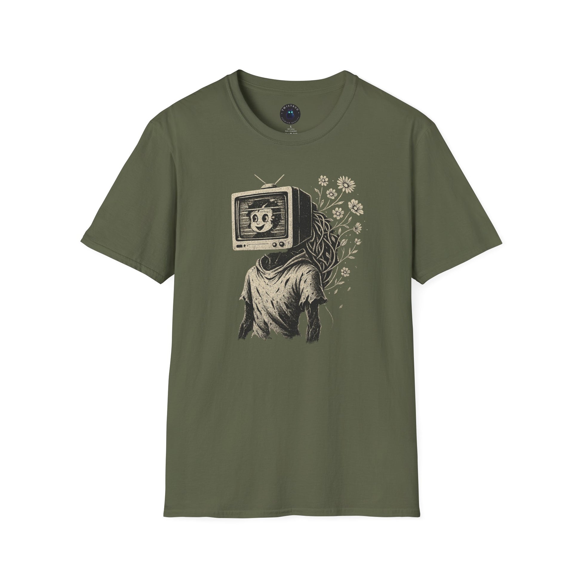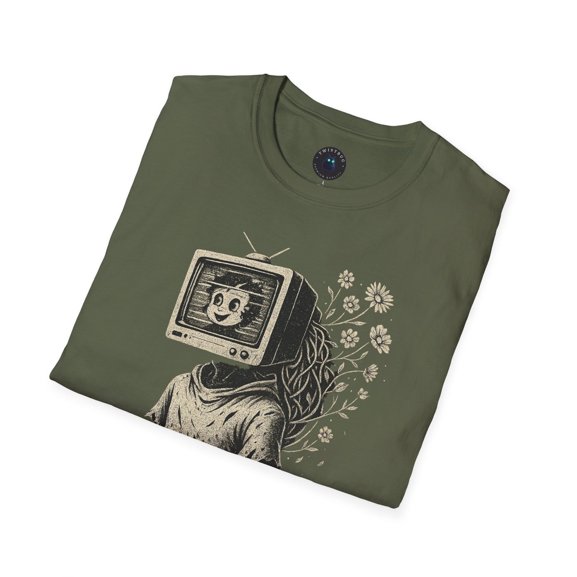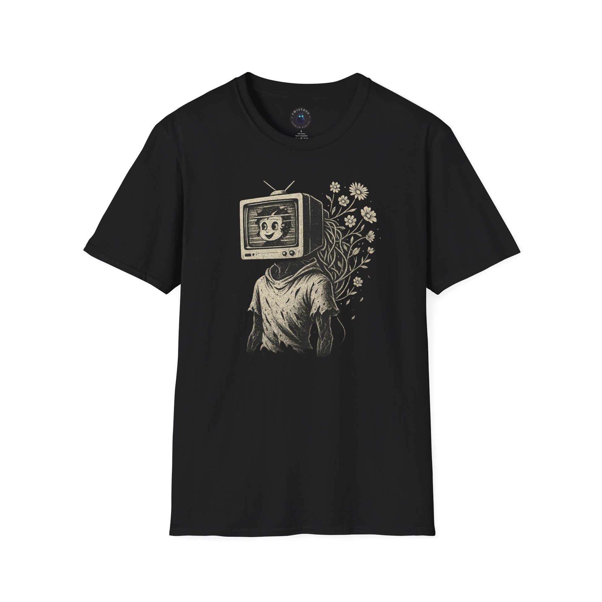 The Blooming Static T-shirt features a hauntingly beautiful illustration of a vintage TV sprouting wildflowers—a symbol of analog rebirth in a digital world. Perfect for lovers of surreal art, retro aesthetics, and nature-meets-technology themes.