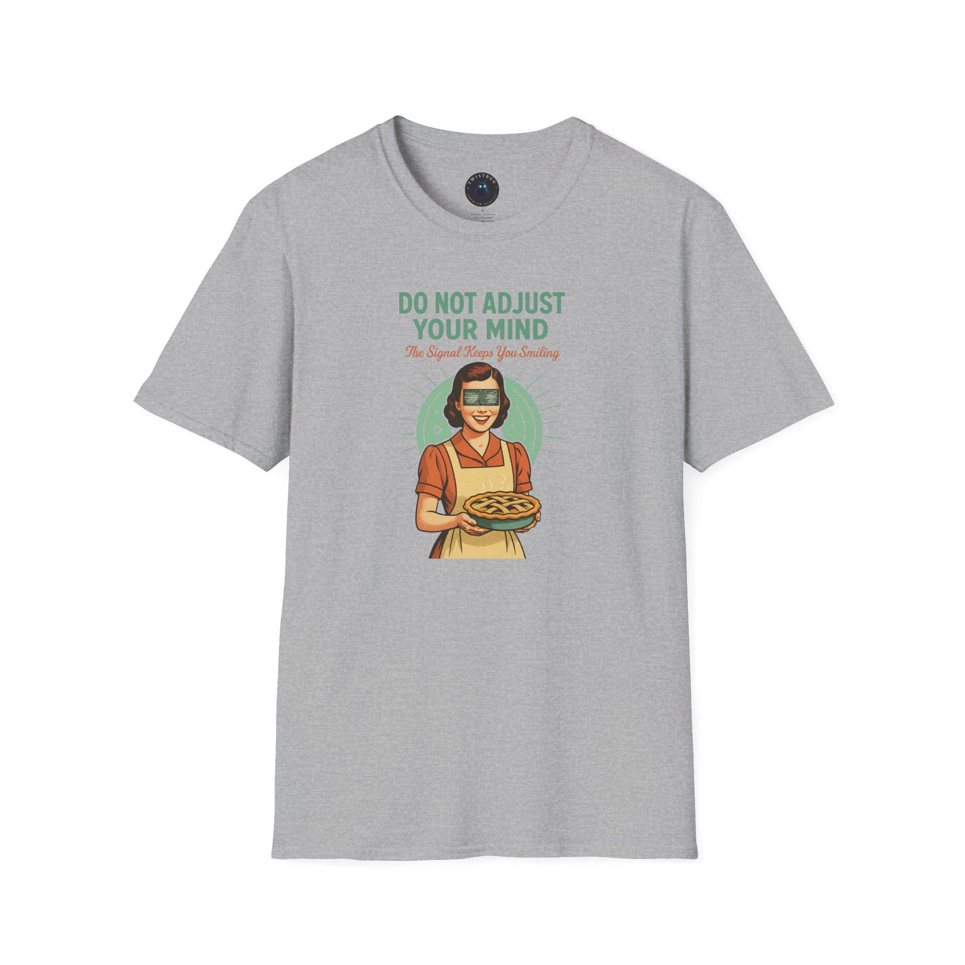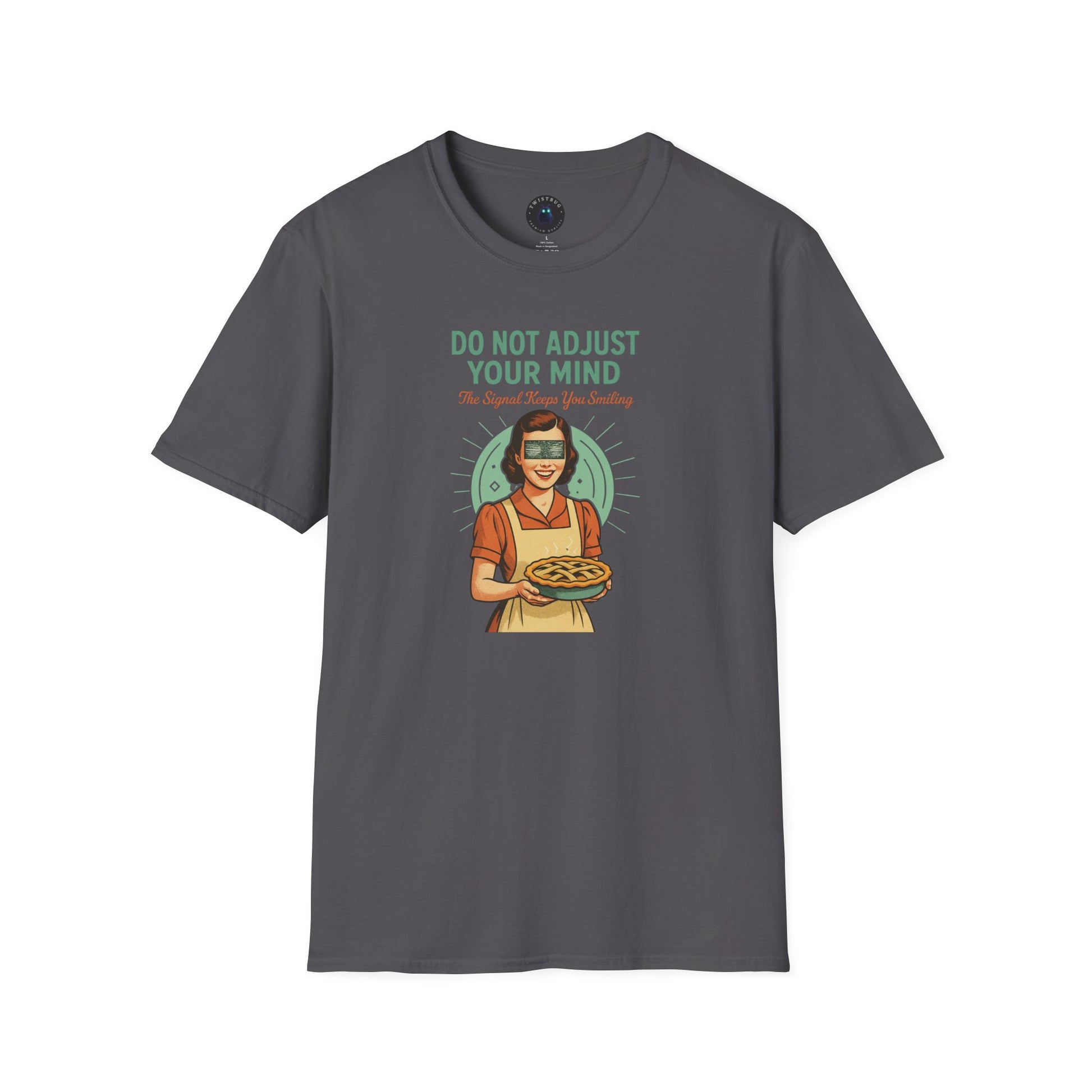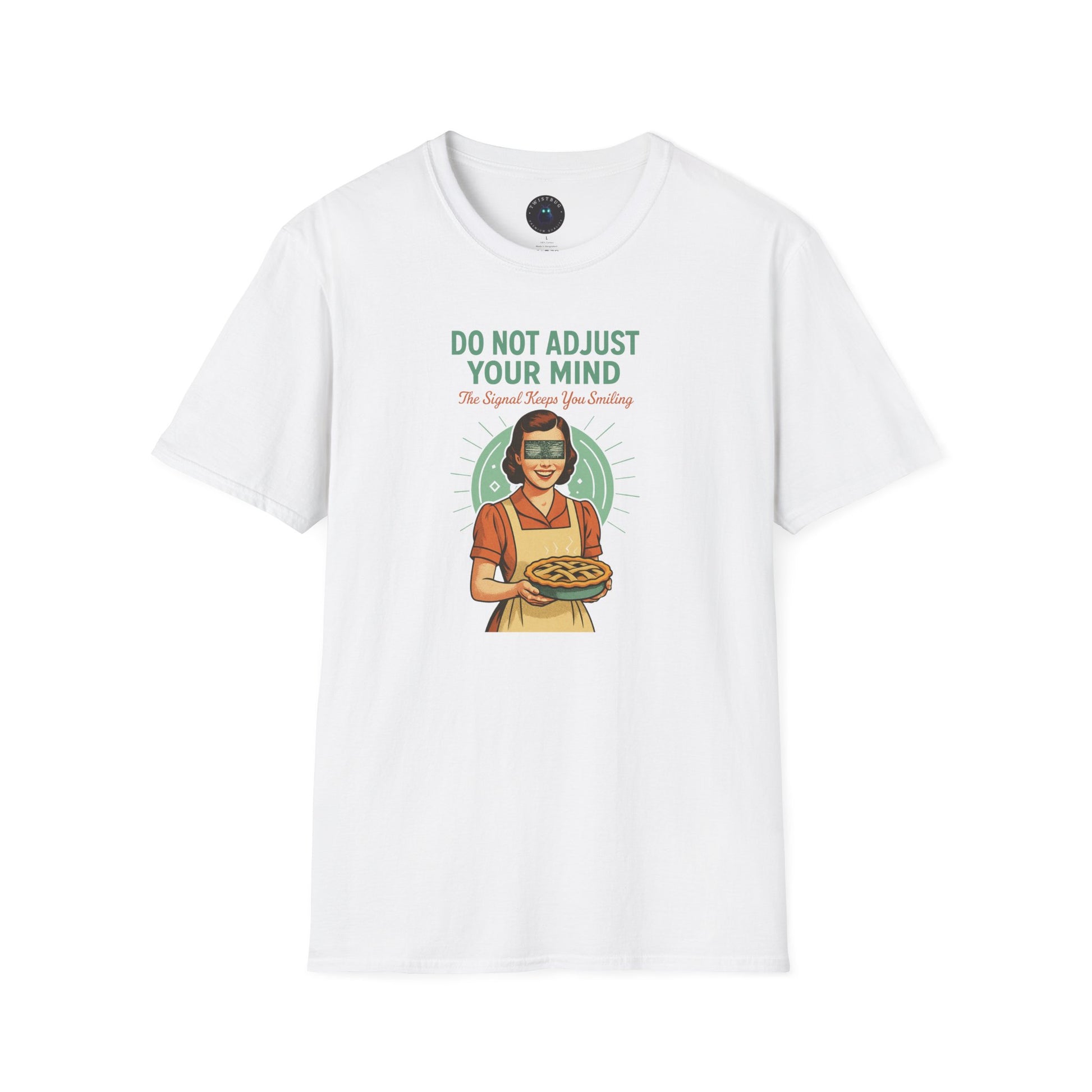 The Do Not Adjust Your Mind T-shirt reimagines mid-century calm through a surreal lens — a smiling 1950s figure caught in the glow of static, holding a pie as the signal hums behind her.