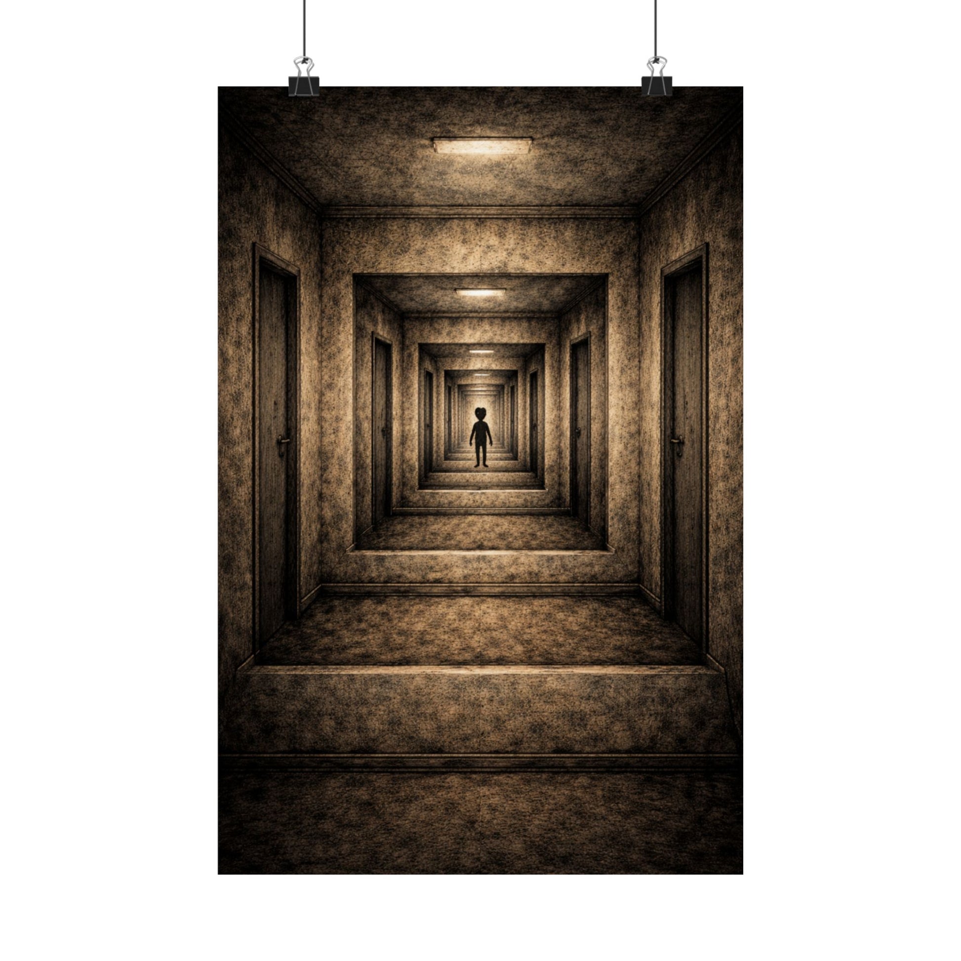 This artwork captures the fear of being trapped inside a repeating reality — a place where time loops, memories blur, and something unseen is always watching. The figure at the center becomes a stand-in for the viewer: lost, small, and suspended inside an endless in-between.