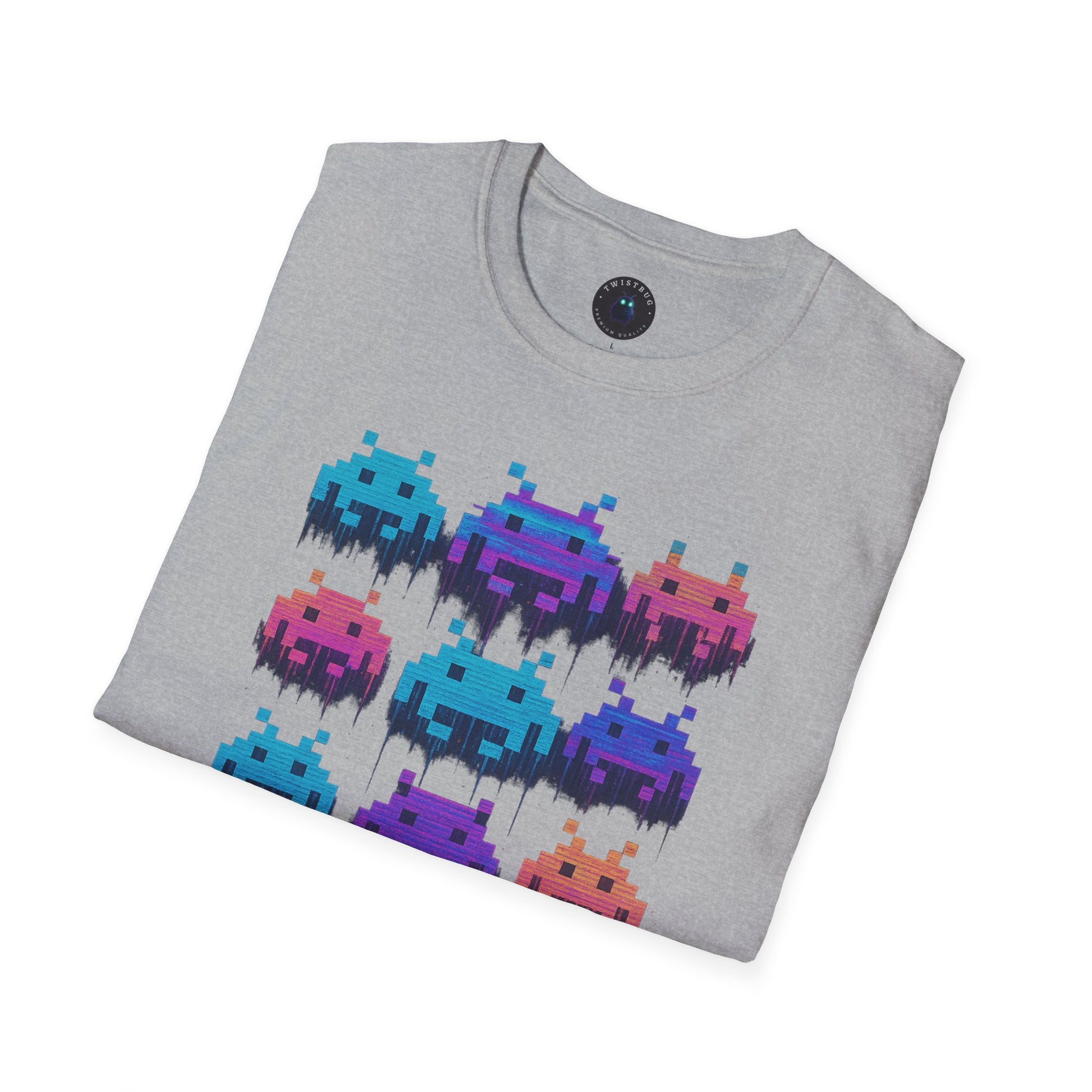 Press start. Pixel Invaders Glitch stacks neon blue–magenta aliens in a clean grid with a dripping glitch effect—pure retro arcade energy. Printed DTG for sharp pixels and rich color on a soft unisex fit (Gildan 64000 style).