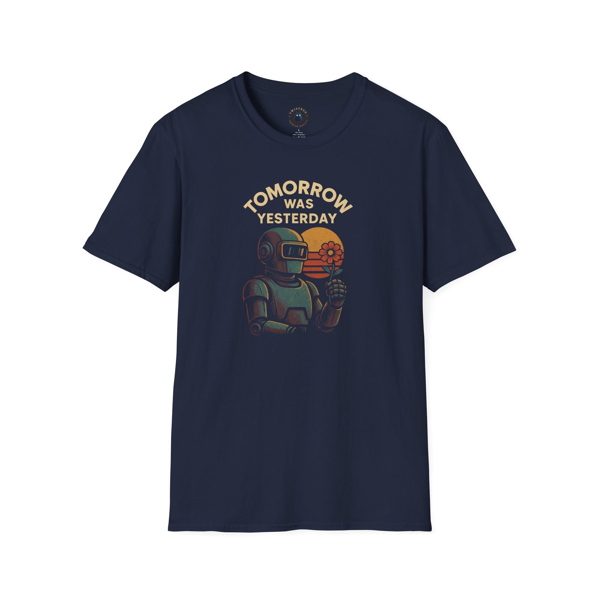 Step into a paradox of time with the “Tomorrow Was Yesterday” graphic tee — a surreal blend of retro nostalgia and future dreams. Featuring a vintage-style robot holding a flower against a fading sunset, this design captures the essence of analog emotion in a digital world.