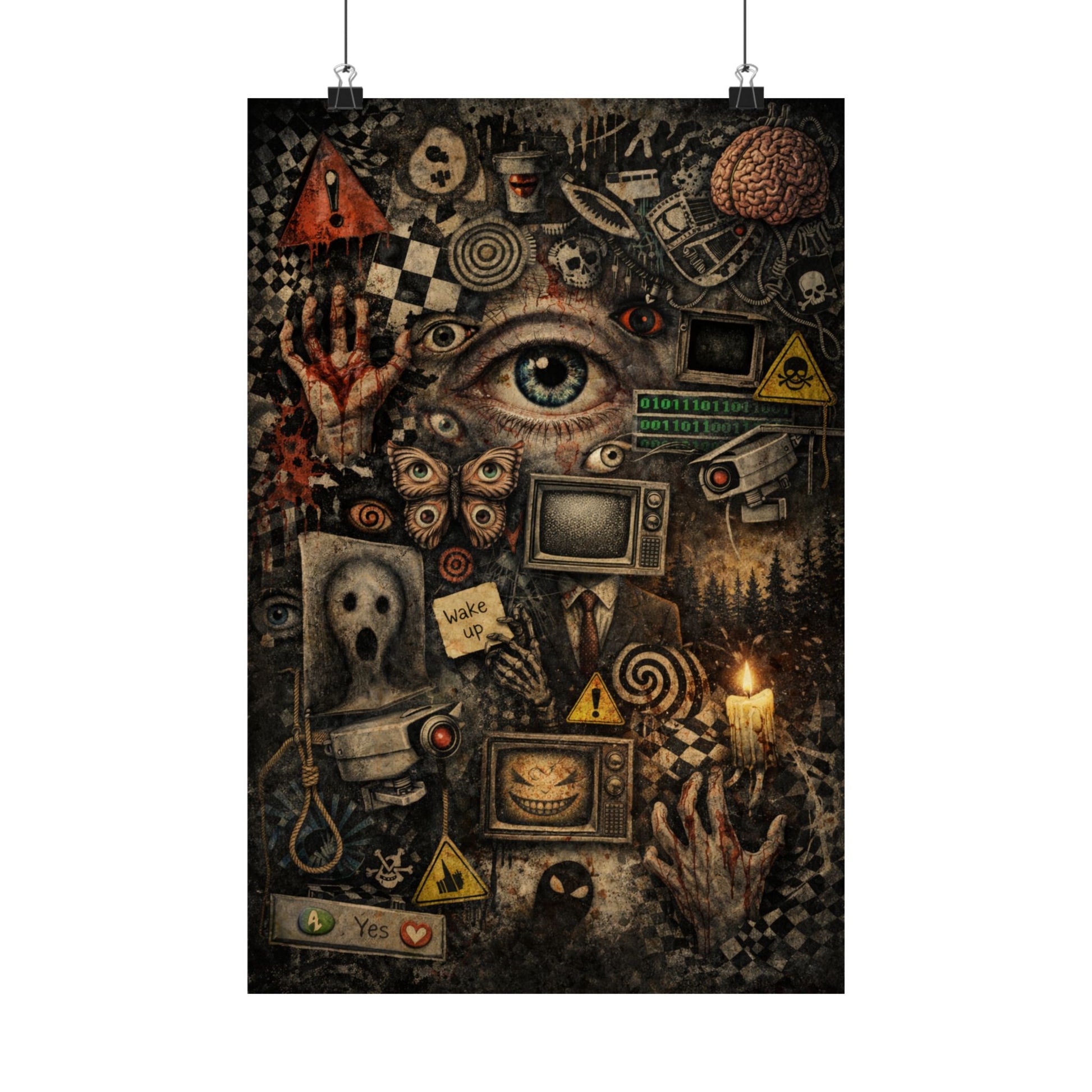 Wake Up – Surreal Horror Collage Wall Art with Eye, TV & Warning Symbols