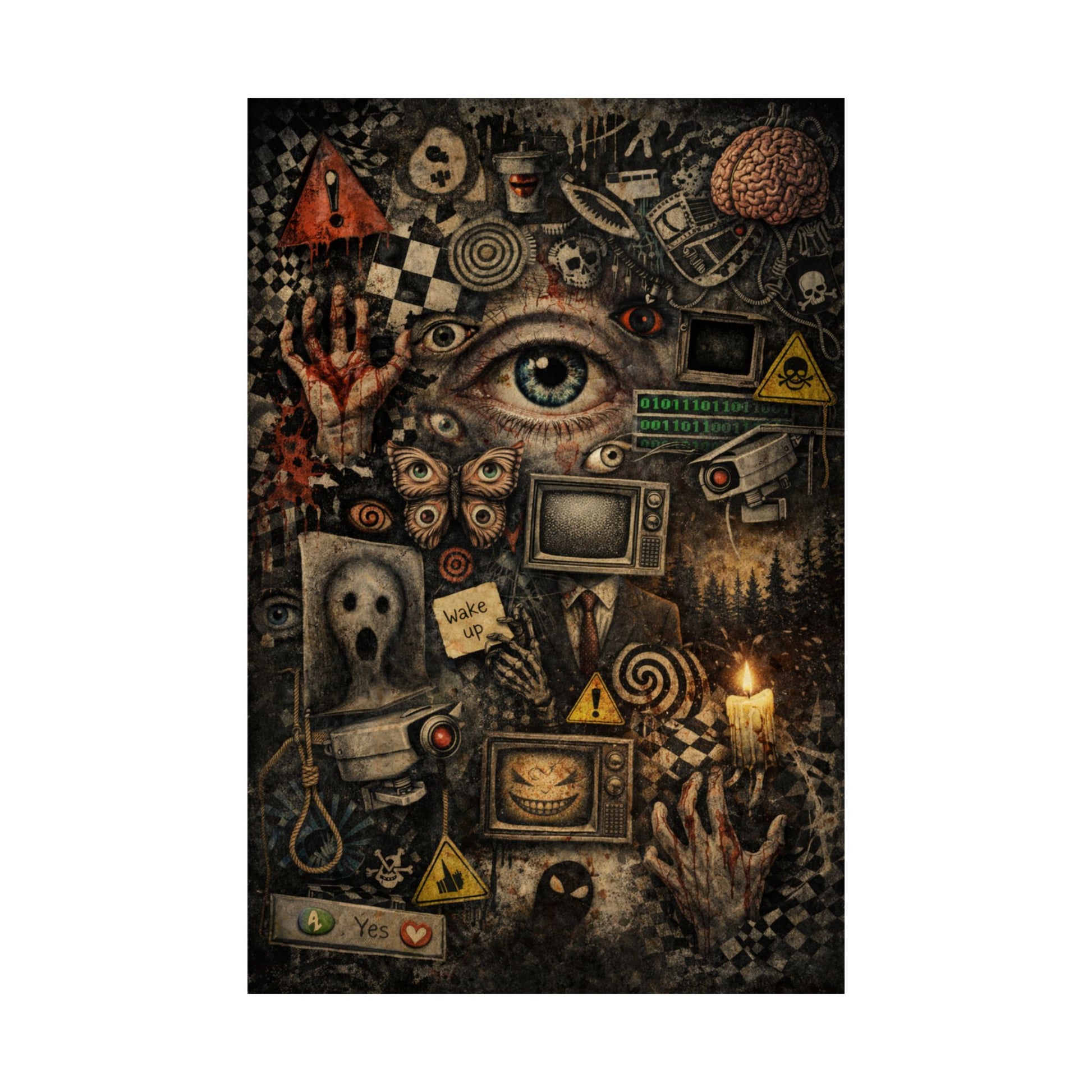 This surreal horror collage pulls the viewer into a fragmented nightmare where eyes, televisions, warning signs, hands, skulls and broken systems collide. It feels like a corrupted broadcast of the human mind — where nothing is safe, nothing is private, and even your thoughts feel monitored.